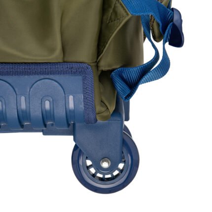 Cuenta con dos compartimentos principales con cierre, ideales para libros, carpetas y cuadernos grandes. Además, incluye un bolsillo frontal para accesorios pequeños y dos bolsillos laterales porta botellas. El carrito posee estructura metálica reforzada, ruedas duraderas y manija extensible. La mochila puede usarse también sin carrito gracias a su espalda acolchada y tiras regulables, brindando versatilidad y comodidad.