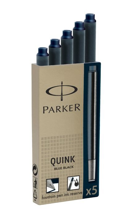 Este kit incluye 5 cartuchos estándar Parker Quink compatibles con plumas estilográficas Parker. La tinta es azul-negra permanente, rica, de secado rápido, resistente a manchas y diseñada para trazos claros y definidos. Cada cartucho posee un pequeño depósito adicional que actúa cuando se alcanza el final de la carga principal, permitiendo escribir algunas hojas más.