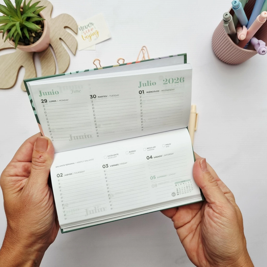 Incluye papel de calidad, diseño interior pensado para una organización precisa, calendario anual y secciones de notas o índice telefónico. Perfecta para quienes necesitan planificación eficiente en un formato minimizado, sin sacrificar estilo ni legibilidad