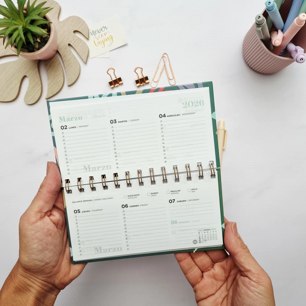 Agenda compacta de la línea Mini Nº7, ideal para quienes buscan eficiencia y portabilidad. Con tapa decorativa y encuadernación en espiral metálica, permite apertura completa para uso cómodo. Su formato de vista semanal permite planificar los siete días de la semana en dos páginas, otorgando claridad y espacio para tareas, citas y notas.