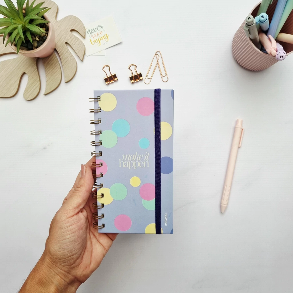 Ideal para quienes buscan organización práctica con estilo portable. Esta agenda Pocket de la línea Imaginer trae vista semanal para visualizar los siete días en una apertura clara, encuadernación espiral metálica que permite apertura total, y tamaño compacto que cabe fácilmente en bolsos o mochilas.