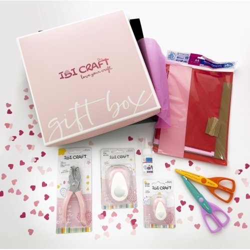 La Box “Love” de IbiCraft es una gift‑box temática con 11 elementos cuidadosamente seleccionados para amantes del craft y scrapbooking. Incluye instrumentos decorativos como tijeras con formas, perforadoras (corazón y círculo), silicona líquida, marcador glitter, papeles especiales y más, todo presentado en una elegante caja rosada. Es ideal como regalo, kit de iniciación o proyecto creativo personal o grupal.