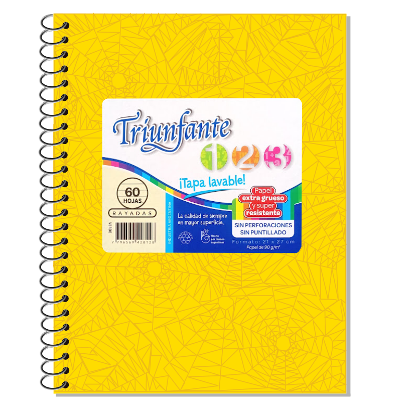 El Cuaderno Triunfante 123 espiral de 60 hojas es ideal para uso escolar y universitario, perfecto para tomar apuntes de forma cómoda y ordenada. Su encuadernación espiralada permite abrirlo 180° y dar vuelta las hojas con facilidad, haciendo más práctico el uso diario. Cuenta con 60 hojas de buena calidad, pensadas para escritura con lápiz o birome sin traspaso excesivo. Es una opción funcional, liviana y rendidora para materias, tareas y notas.