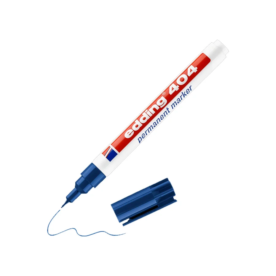 El Edding 404 azul es un marcador profesional diseñado para trazos muy finos en superficies como metal, plástico, vidrio, cartón, telas o cerámica. Su punta redonda de solo 0,75 mm permite escritura o etiquetado extremadamente preciso. Utiliza tinta permanente de secado rápido, resistente al agua y al desgaste, con bajo olor y libre de tolueno o xileno. El diseño compacto incluye clip antivuelco y tapa que se puede guardar en el extremo.