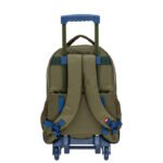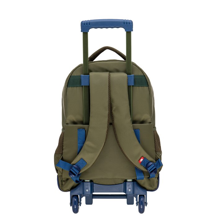 Cuenta con dos compartimentos principales con cierre, ideales para libros, carpetas y cuadernos grandes. Además, incluye un bolsillo frontal para accesorios pequeños y dos bolsillos laterales porta botellas. El carrito posee estructura metálica reforzada, ruedas duraderas y manija extensible. La mochila puede usarse también sin carrito gracias a su espalda acolchada y tiras regulables, brindando versatilidad y comodidad.