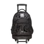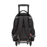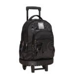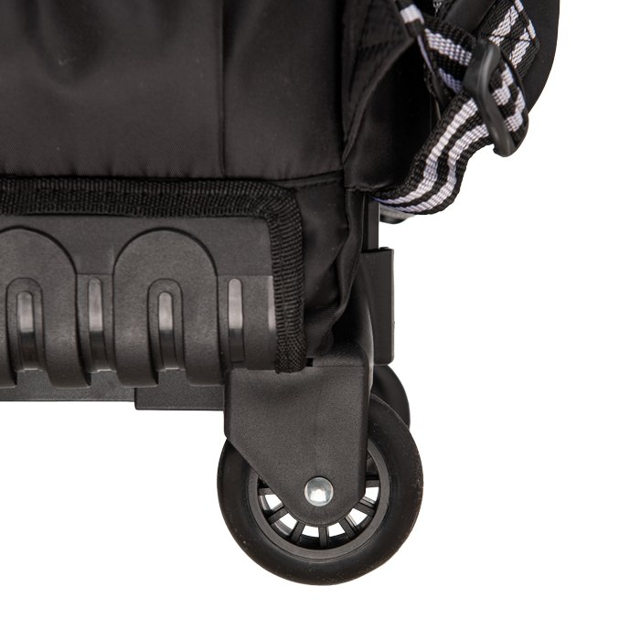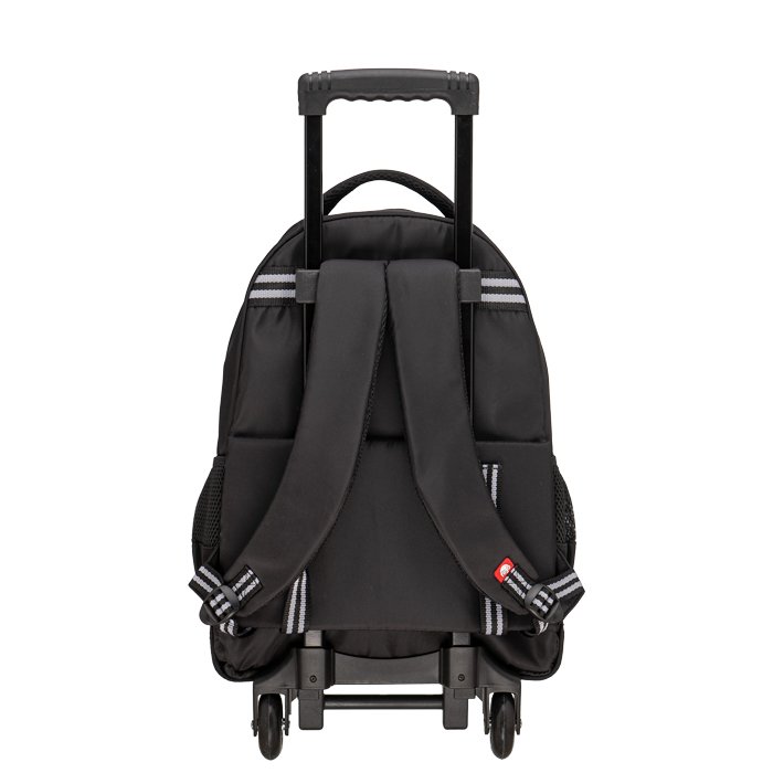 Incluye dos compartimentos principales con cierre, pensados para cuadernos grandes, carpetas y libros. También cuenta con un bolsillo frontal para accesorios de acceso rápido y dos bolsillos laterales porta botellas. El sistema de carro tiene estructura metálica reforzada, ruedas resistentes y manija extensible, mientras que la mochila puede usarse sin carrito gracias a su espalda acolchada y tiras regulables. Es una opción práctica, durable y con mucho estilo.