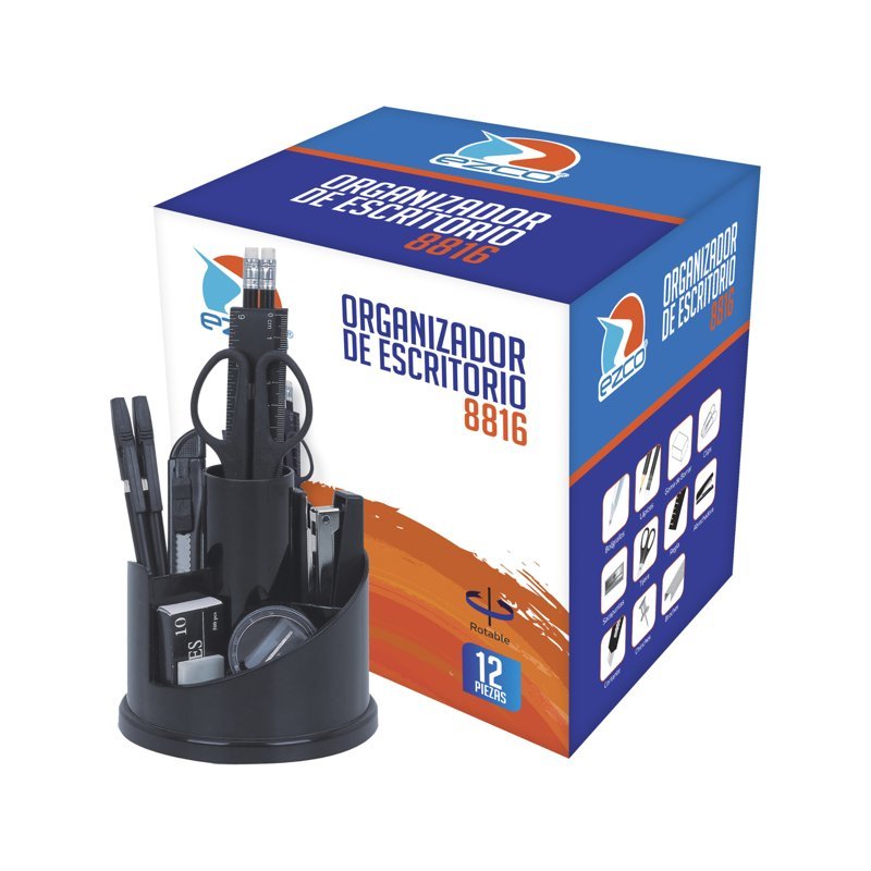 El organizador Ezco modelo 8816 es una solución práctica y compacta para mantener el escritorio ordenado sin resignar estilo. Su diseño circular con base giratoria permite acceder cómodamente a todos los artículos desde cualquier ángulo, optimizando espacio y funcionalidad.